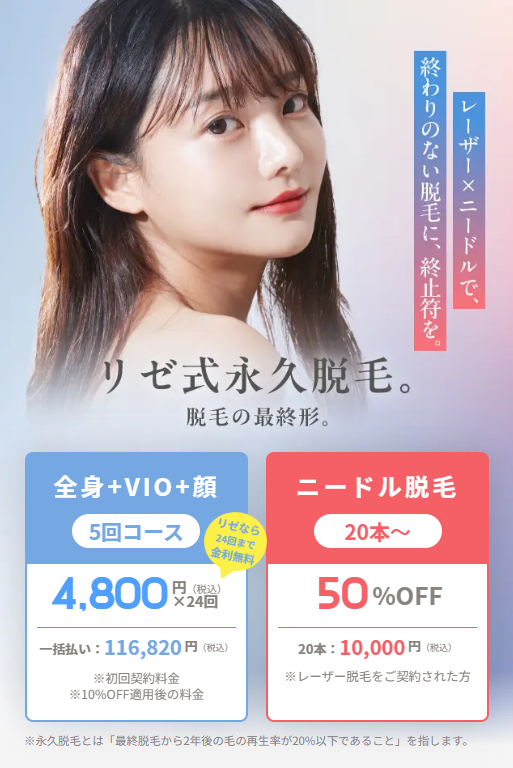| 脱毛プラン: | ・全身脱毛(顔・VIO含む) 5回:129,800円(税込) ・全身脱毛(VIO含む) 5回:99,800円(税込) ・全身脱毛(顔・VIOなし) 5回:64,800円(税込) |